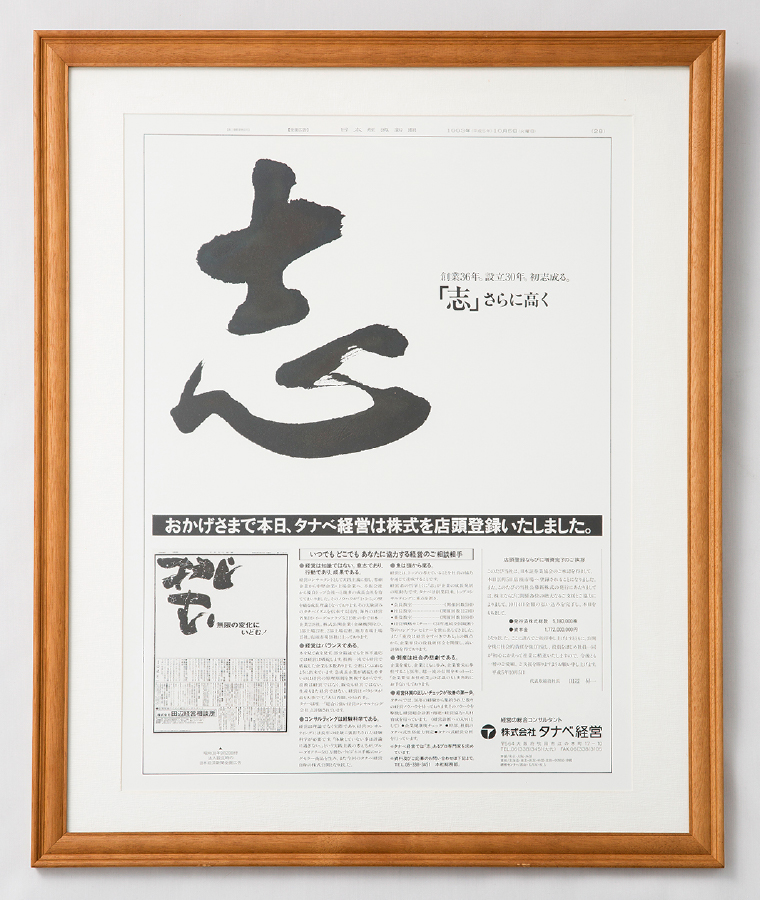 そして創業から36年後、法人設立30年後の1993年10月に、株式公開(店頭公開)を果たすことになります。クライアント企業も成長の過程で上場するようになり、実践主義を標榜する私たち自身が上場することで、さらにその意味が増すと考えたからです。その際にも、日本経済新聞の全面に広告を掲載。メッセージは「志 — 志さらに高く」。当時の日本では、経営コンサルティング会社の上場自体が珍しいことでした。